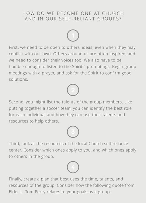 When Nephi was commanded to build a boat, he didn’t pray for the Lord to help him find tools; he prayed to know where to find ore in order to make his own tools. Your group meetings are a way of finding the ore—the resources your group needs—to create the tools to help all in the group succeed. Working in groups can help us all on our individual path. President Monson has said: