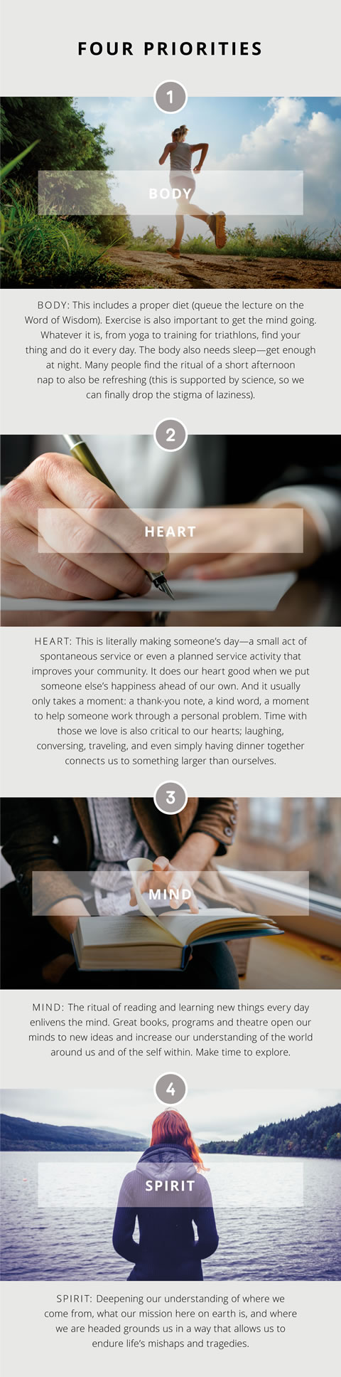 Mr. Schwartz goes on to identify four priorities in our life that we need to focus our daily rituals around in order to be at our best: body, heart, mind, and spirit. Let’s look at each: