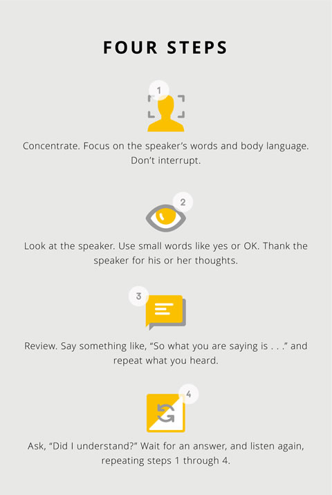 Listening is a skill. It takes practice. These four steps can help you be a good listener: