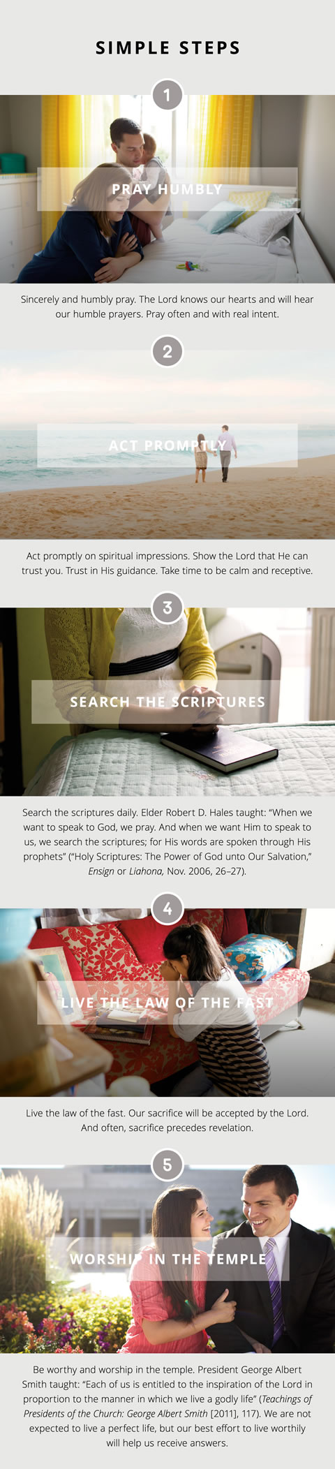 Our listening skills will also sharpen as we learn to listen to the Spirit. Sometimes the Holy Ghost gives us answers to our prayers and we miss the personal inspiration because we are distracted by concerns or to-do lists. In a 2014 CES devotional, Sister Linda K. Burton gave some simple steps to help us receive personal revelation.